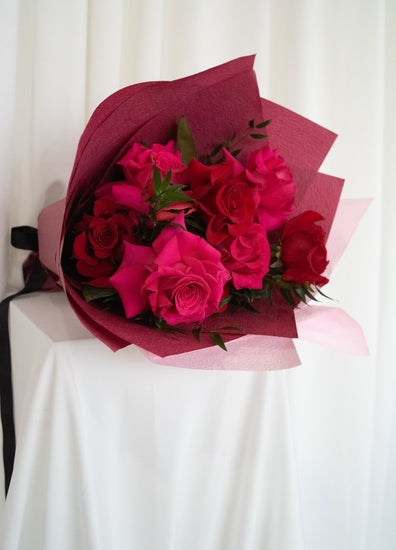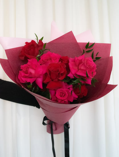 x12 stems of the freshest roses in a mix of reds and pinks, beautifully gift wrapped